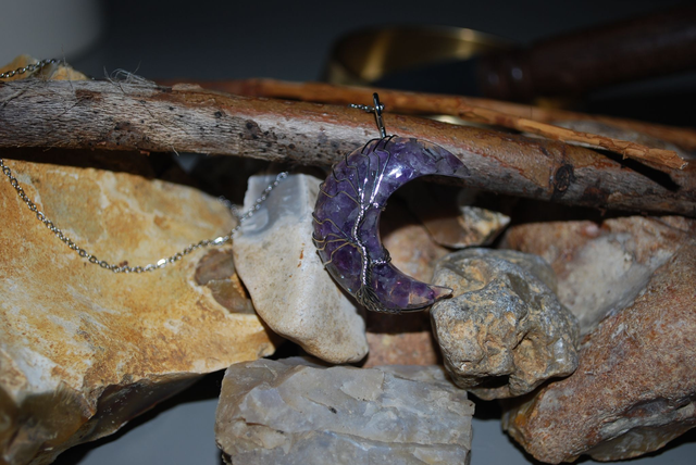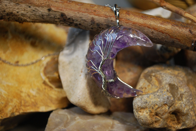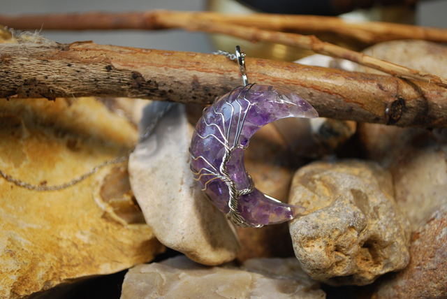 Ce collier artisanal est orné d'un magnifique pendentif en améthyste naturelle en forme de croissant de lune.