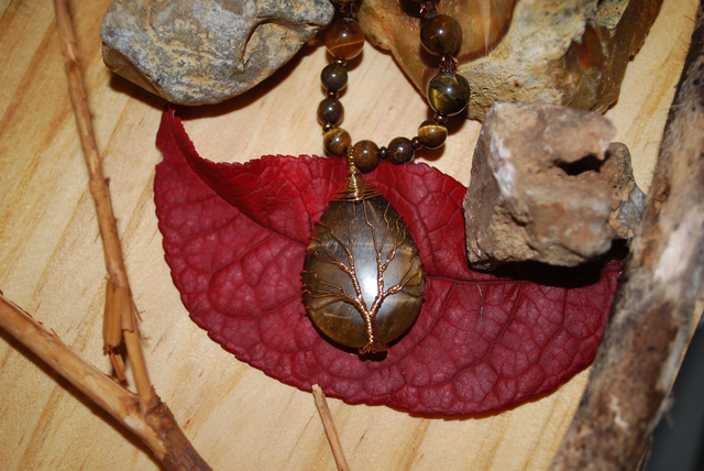 Le pendentif en forme de goutte, également en œil de tigre, est serti d'un arbre de vie en fil doré, symbolisant la croissance et la connexion à soi-même.