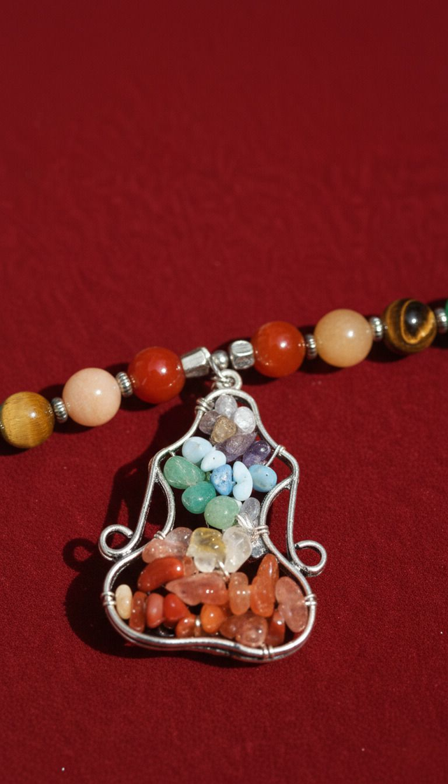 Le pendentif, rempli de pierres de sept chakras, symbolise la paix intérieure et la connexion spirituelle.