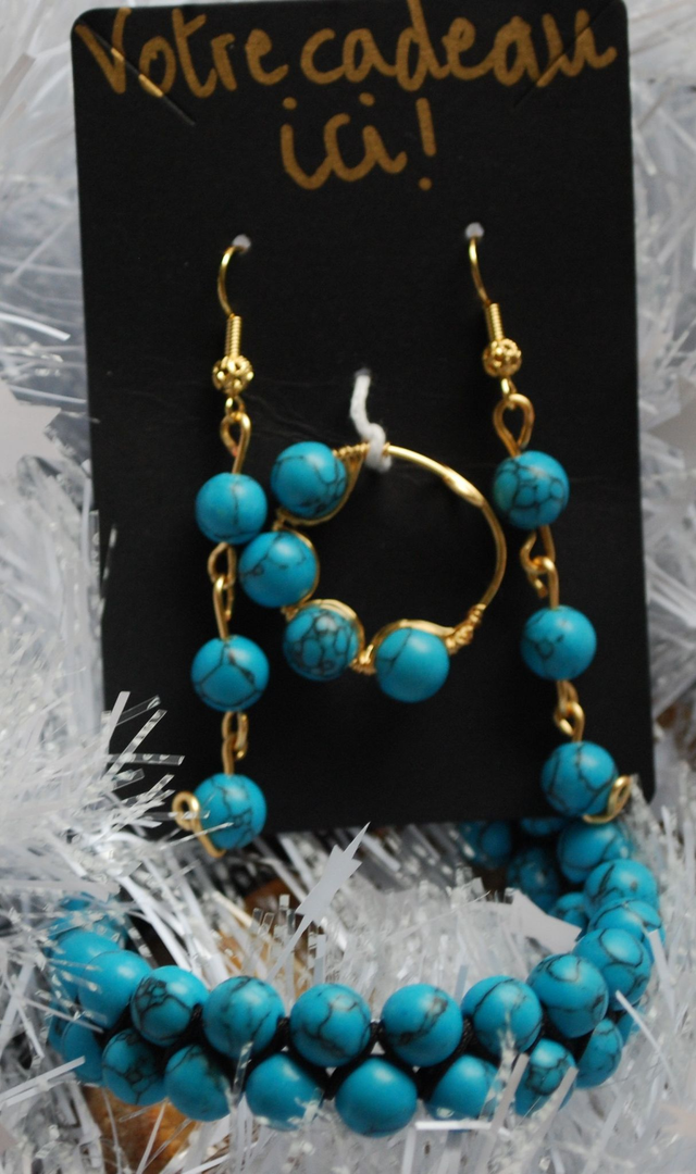 Acheter le bracelet en turquoise et recevez votre parure complète assortie : une bague et une boucle d'oreille en turquoise, toutes deux faites main.